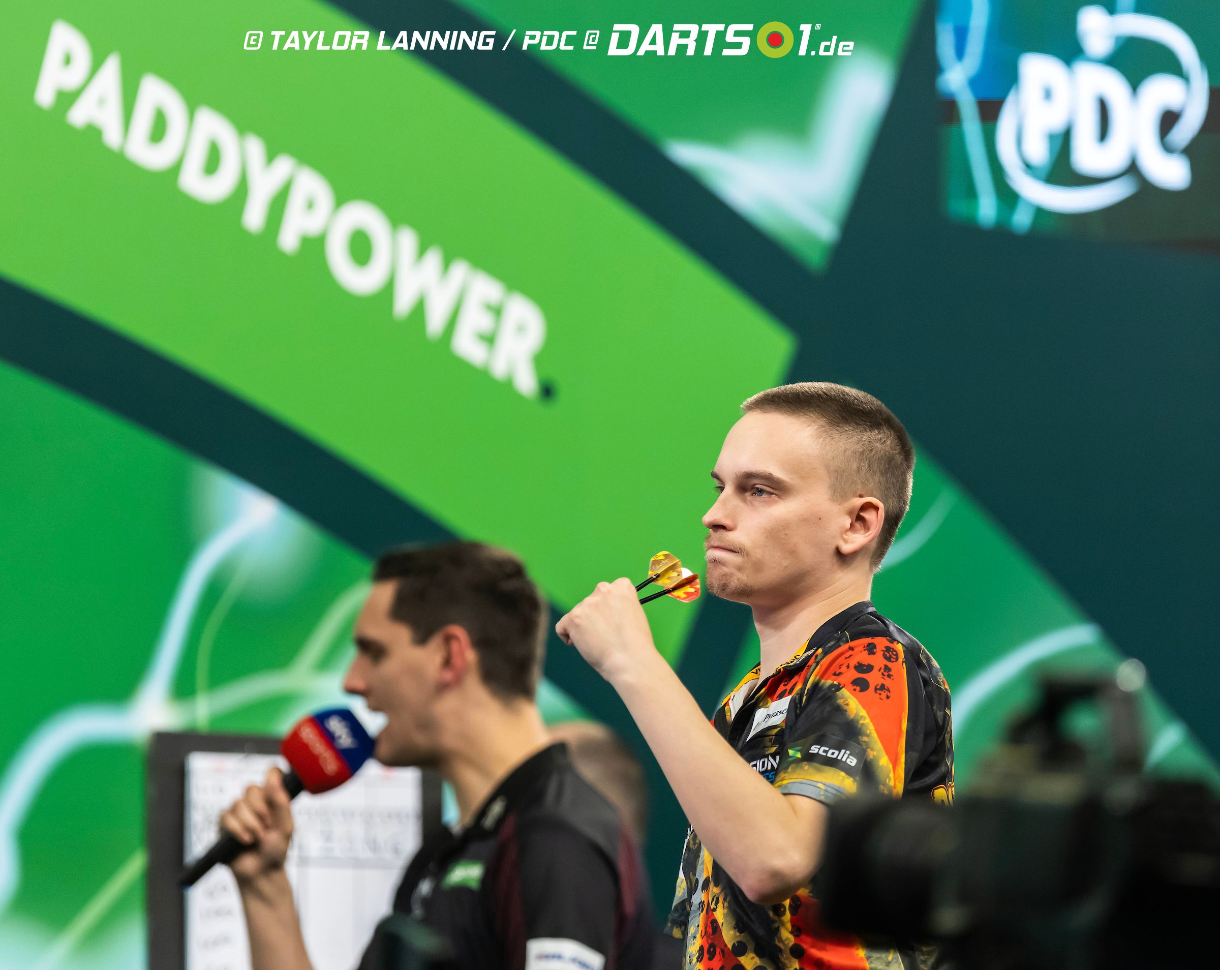 Aus deutscher Sicht folgte als nächstes der vorläufige Höhepunkte des Abends: der erste Auftritt von Ricardo Pietreczko, der bei der letzten WM, Luke Humphries an den Rande einer Niederlage gespielt hatte, bevor „Cool Hand, Luke“ zu einem phänomenalen Comeback ansetzte und das Match doch noch zu seinen Gunsten drehte. Ricardo Pietreczko hatte am heutigen Abend verraten, dass er bei Duellen gegen asiatische Gegner immer enorm angespannt sei, weil er die Menschen jener höflich gesitteten Ethnizität besonders gern mag, die Sympathiebekundung übe aber gerade deswegen einen zusätzlichen Druck auf ihn aus. Im letzten Jahr hätte er schon darunter gelitten, in der ersten Runde ausgerechnet gegen die Japanerin Mikuru Suzuki antreten zu müssen und auch dieses Jahr stand mit dem Chinesen Xiao-Chen Zong wieder ein asiatischer Sympathieträger gegenüber.
