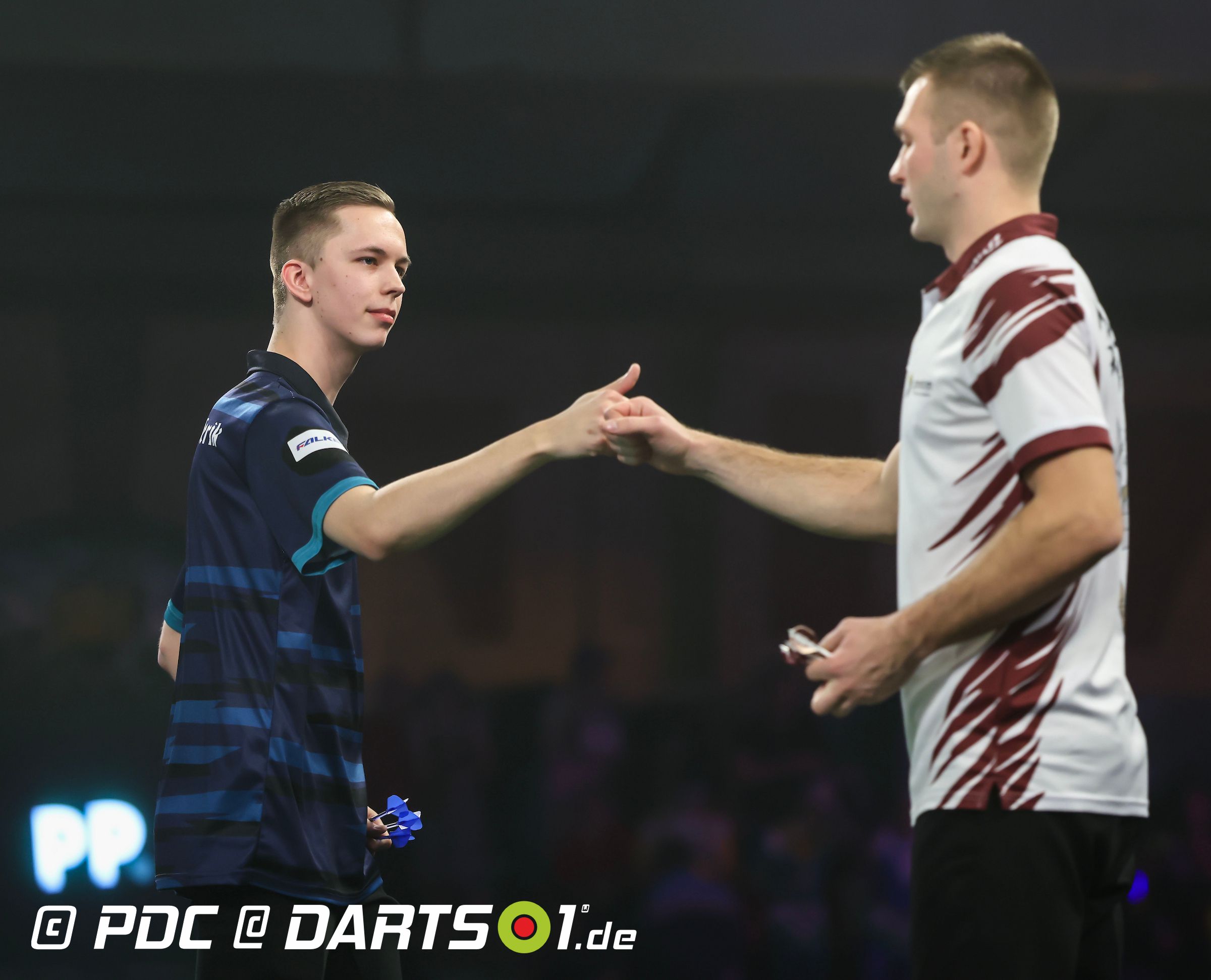 Zum Abschluss des Abends setzte sich Madars Razma gegen WM-Neuling Jamai van den Herik durch. Der Lette startete stark mit schnellen Legs, verlor jedoch im zweiten Satz kurz die Kontrolle. Van den Herik traf vier 180er und blieb mit 81,33 Punkten im Average stets dran.