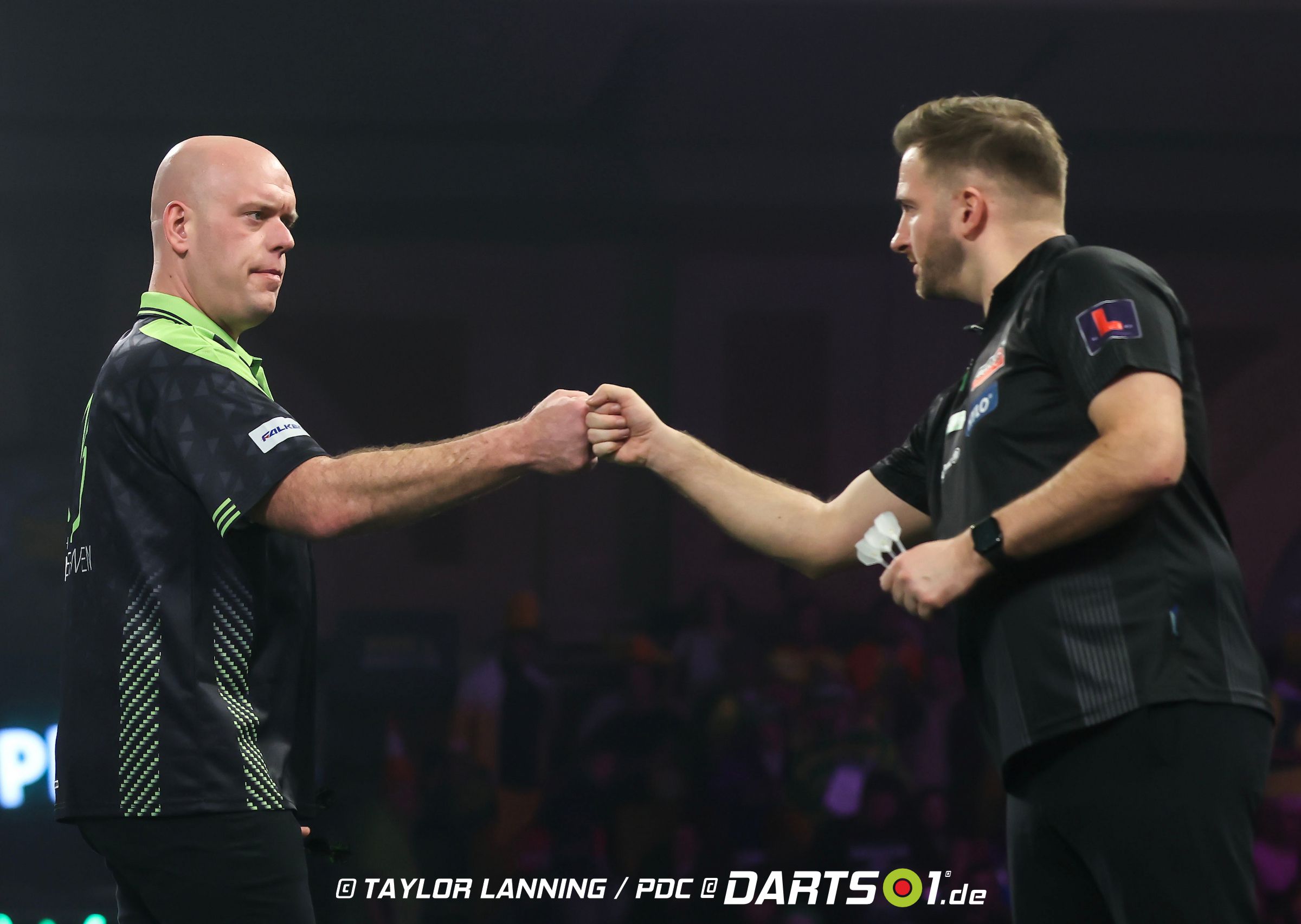 Zwar setzte Merk mit einem 145er-Finish ein Ausrufezeichen, doch van Gerwen konterte mit konstant hohem Scoring, neun Maxima und einer Doppelquote von 50 Prozent. „Mighty Mike“ gewann sechs der letzten acht Legs und machte damit souverän den Einzug ins Achtelfinale perfekt.