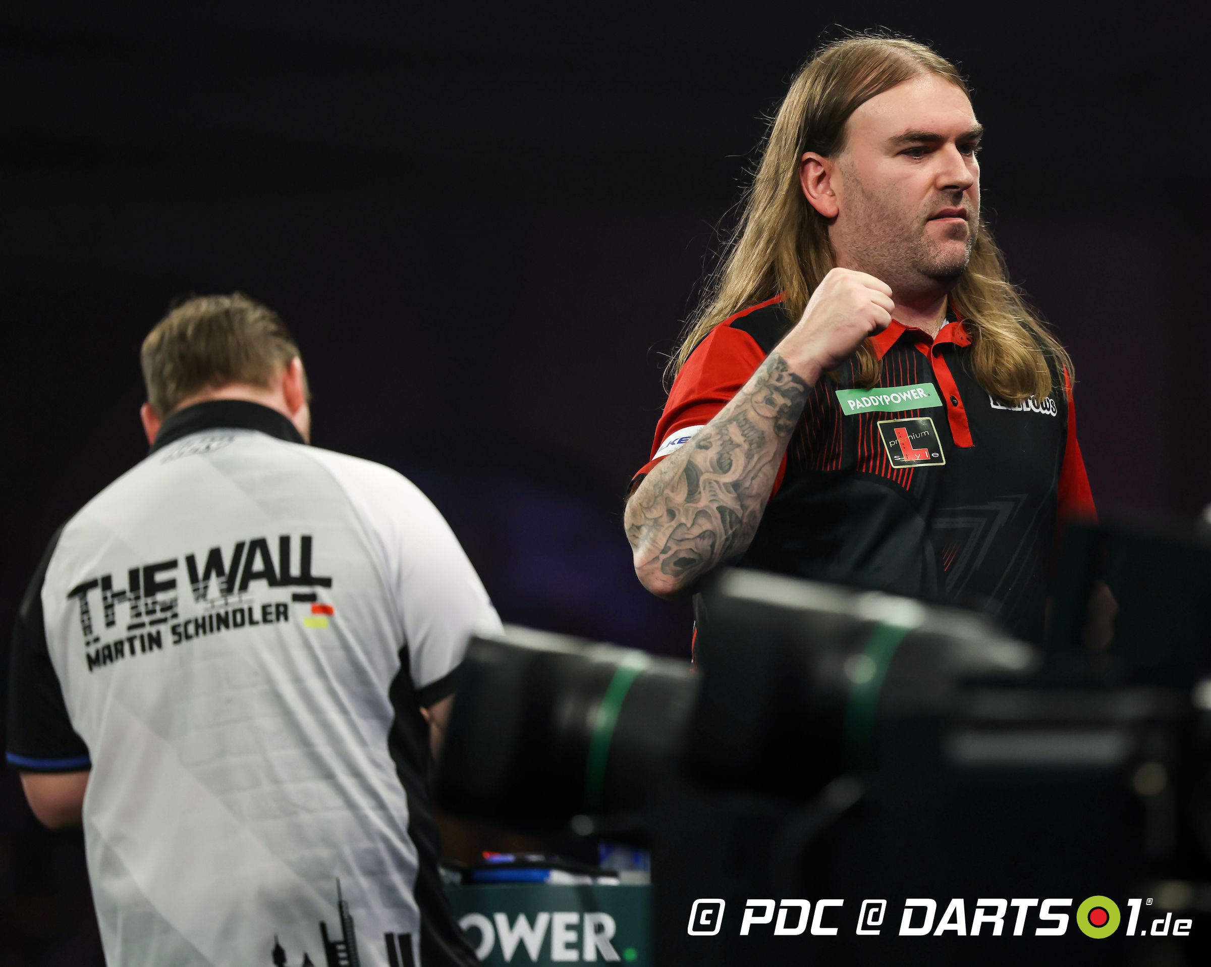 Den Auftakt der Nachmittagssession machte Ryan Searle – und der Engländer setzte Martin Schindler von Beginn an unter permanenten Druck. Zwar hielt der Deutsche in den ersten beiden Sätzen jeweils ein Leg mit, doch Searle war auf den Doppeln deutlich effizienter und sicherte sich eine schnelle 2:0-Führung (3:1, 3:1).