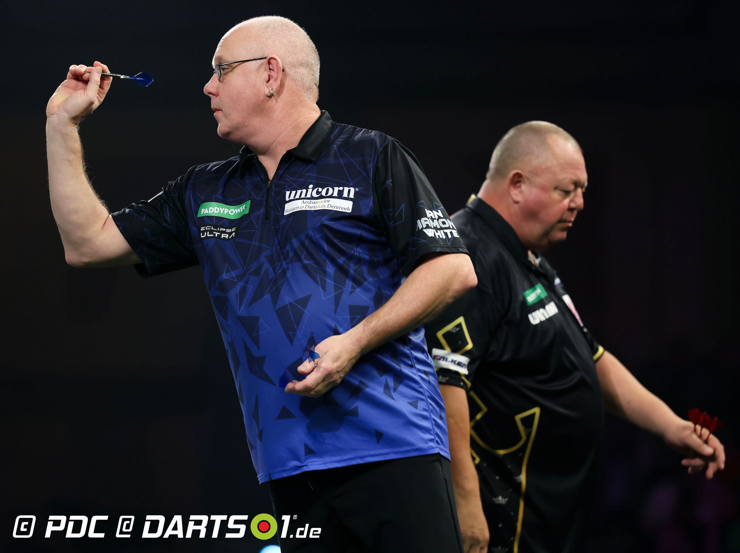 Deutlich enger ging es anschließend zwischen Ian White und Mervyn King zu. White erwischte den besseren Start, zog schnell auf 2:0 davon und schien bereits auf der Siegerstraße. Doch King kämpfte sich mit zunehmender Spieldauer zurück und glich zum 2:2 aus. Im Entscheidungsset behielt White dann die Nerven und holte sich mit 3:2 den Sieg. Beide Akteure blieben im Average knapp über 81 Punkten, am Ende gab die bessere Doppelquote von White (30 %) den Ausschlag.