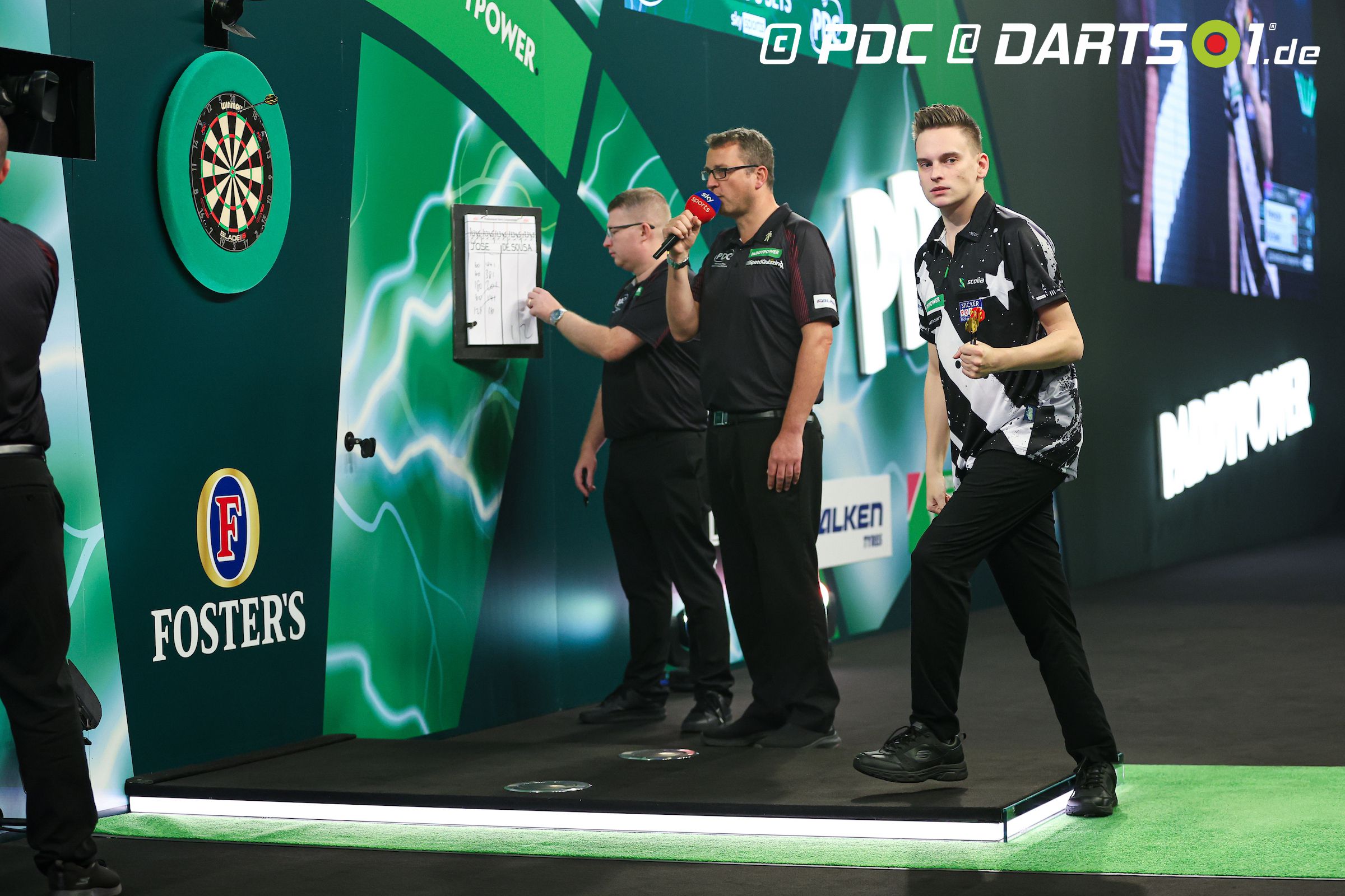 Die Abendsession eröffnete Ricardo Pietreczko, der sich mit 3:1 gegen José de Sousa durchsetzte. Trotz sechs 180ern des Portugiesen behielt der Deutsche in den entscheidenden Situationen die Oberhand. Besonders in den ersten beiden engen Sätzen zeigte Pietreczko seine Nervenstärke.
