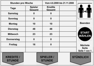 | Statistikdaten: | Zeigt die Anzahl Spieler für jedes Spiel, die Anzahl verspielter Kredite für jedes Spiel und den programmierten Spielpreis für jedes Spiel. |