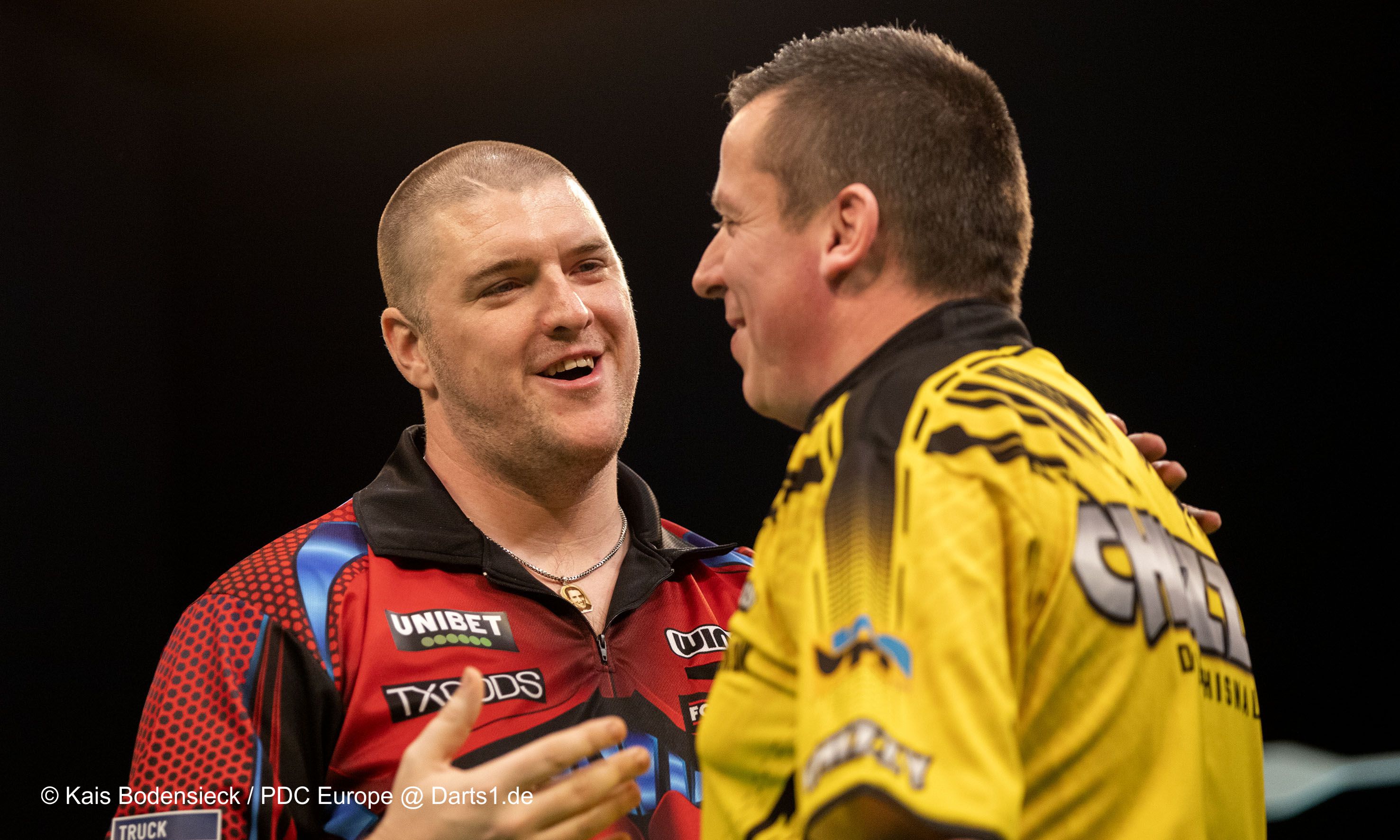 Für die Eröffnung des entscheidenden Tages in Göttingen waren also Rob Cross und Ricky Evans verantwortlich. Cross legte mit einem 13-Darter los, produzierte anschließend frühestmöglich ein Break, ließ diesem einen weiteren 13-Darter folgen. „Rapid“ erhielt erst im vierten Leg die ersten Möglichkeiten, setzte aber fünf Darts an Doppeln vorbei. Cross war wieder zur Stelle und löschte 61 Zähler. Nachdem er Weltranglistenzweite auch noch 70 Punkte mitnehmen konnte, gewann er die erste Sequenz tatsächlich zu Null. Unter dem Jubel der Zuschauer holte sich Evans nach der Unterbrechung sein erstes Erfolgserlebnis, doch Cross antwortete sofort und zeigte einen starken 11-Darter inklusive 82er-Finish. Nachdem auch die nächsten beiden Legs geteilt wurden, erwischte Evans die doppelte 5 und stellte so den Pausenstand von 3:7 aus seiner Sicht her. Zurück vor den Kameras erzielte Evans per 13-Darter erstmals ein Break. Weil er dieses auch bestätigen konnte, betrug der Rückstand nur noch zwei Legs. Mehr ließ „Voltage“ in dieser Situation aber nicht zu, weil er einen weiteren 13-Darter spielte. Zwar kam Evans wieder heran, doch Cross blieb im 15. Leg beim eigenen Anwurf souverän und benötigte jetzt nur noch einen Leggewinn. Nachdem Evans dann knapp an einem 160er-Finish scheiterte, war es soweit, Cross verwandelte in der Doppel-16 und war nach dem 10:6 der erste Halbfinalist.