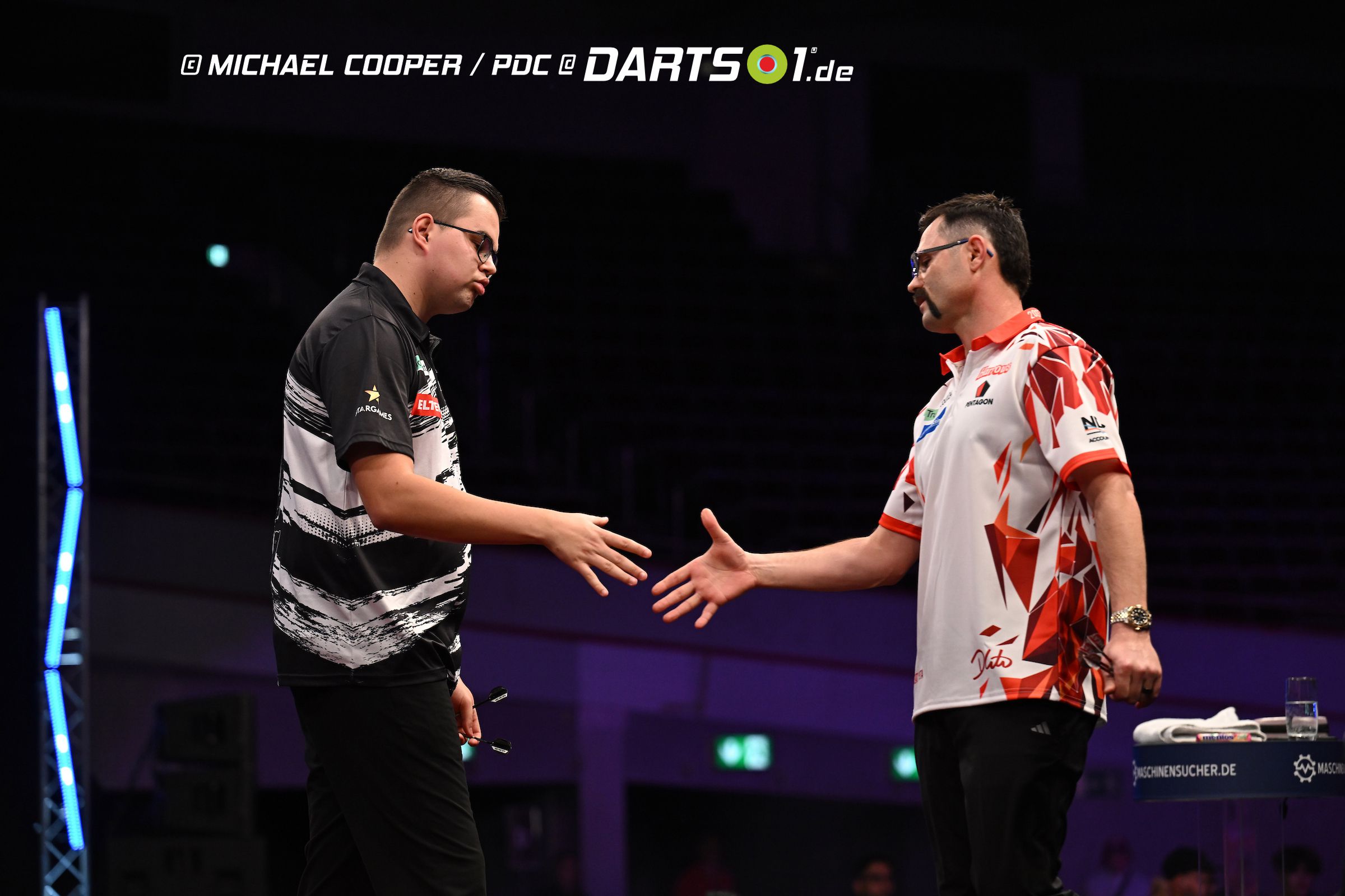 Gian van Veen zeigte eine starke Leistung und besiegte Damon Heta in seiner Auftaktpartie mit 6:3. Der junge Niederländer legte furios los und sicherte sich die ersten vier Legs in Folge. Mit einem 86er-Checkout im ersten Leg und einer 180 im zweiten setzte er früh ein Zeichen, während Heta Schwierigkeiten hatte, sein Scoring aufrechtzuerhalten. „The Giant“ nutzte dies konsequent aus und baute seinen Vorsprung durch präzise Finishes, darunter ein 78er-Checkout, auf 4:0 aus. Heta fand im fünften Leg endlich zu seinem Spiel und verkürzte mit einem 127er-Finish auf 4:1. Doch van Veen blieb unbeeindruckt und stellte mit einem weiteren Leg auf 5:1, gestützt auf einen Average von rund 99 und eine solide Doppelquote. Heta kämpfte sich mit zwei starken Legs, darunter ein 92er-Checkout, auf 3:5 heran, doch van Veen behielt die Kontrolle. Im neunten Leg schloss er das Match mit einem sicheren Doppeltreffer ab.