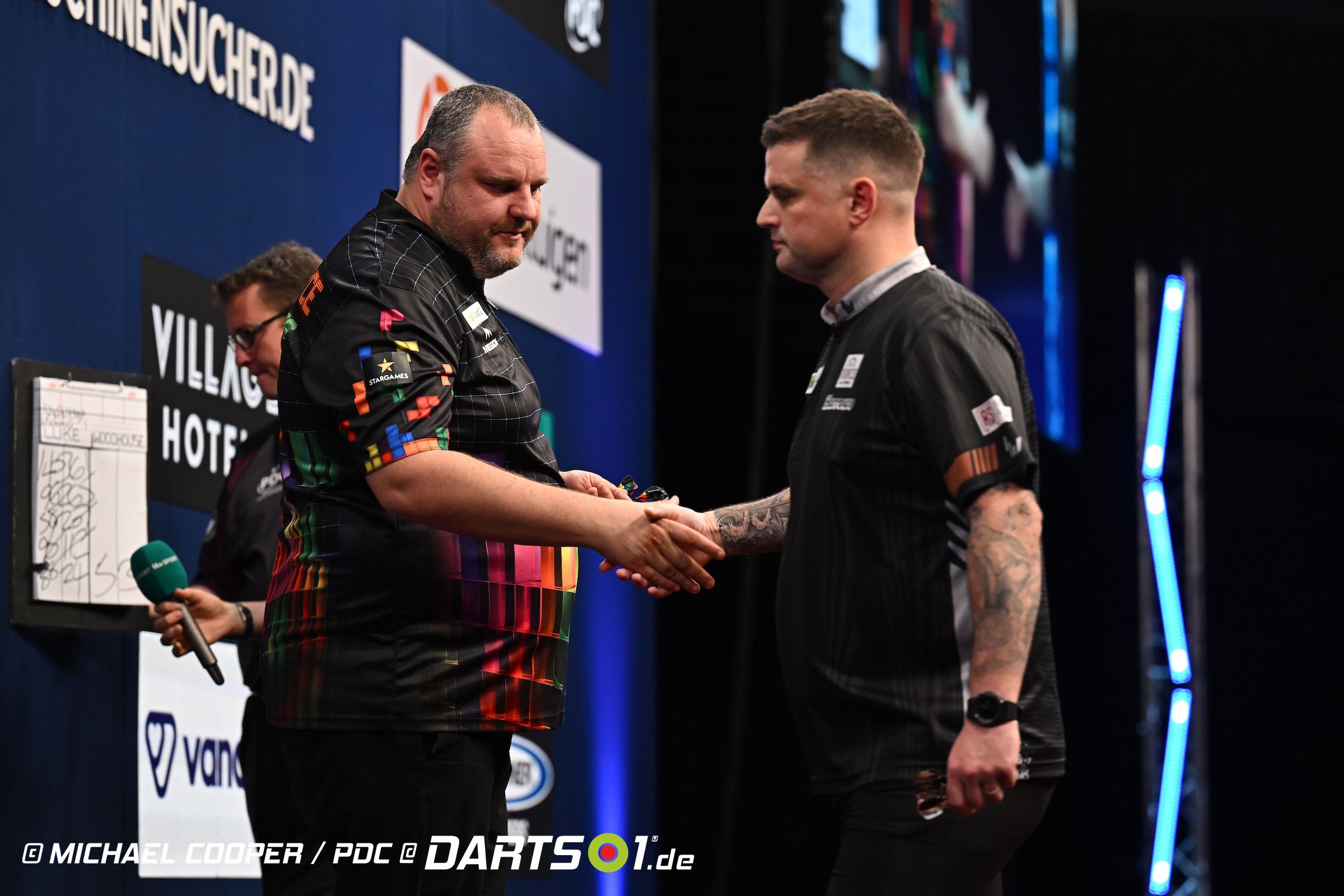 Daryl Gurney setzte sich in einem intensiven Duell mit 6:3 gegen Gerwyn Price durch. Die Partie, die an ihr hitziges Aufeinandertreffen beim World Matchplay erinnerte, begann mit einem starken Auftakt des Nordiren, der rasch mit 2:0 in Führung ging. Price konterte und verkürzte auf 1:2, doch Gurney stellte mit einem weiteren Leg den alten Abstand wieder her. Der Waliser fand anschließend besser ins Spiel, verkürzte auf 2:3 und glich zum 3:3 aus. Danach übernahm jedoch wieder Gurney das Kommando, gewann die nächsten drei Legs zum 6:3 und machte den Sieg souverän perfekt. „Ich musste konsequent bleiben – Gerwyn ist immer gefährlich“, sagte Gurney nach dem Match. Mit diesem Erfolg zieht er in die zweite Runde ein, während Price eine weitere Enttäuschung verkraften muss.