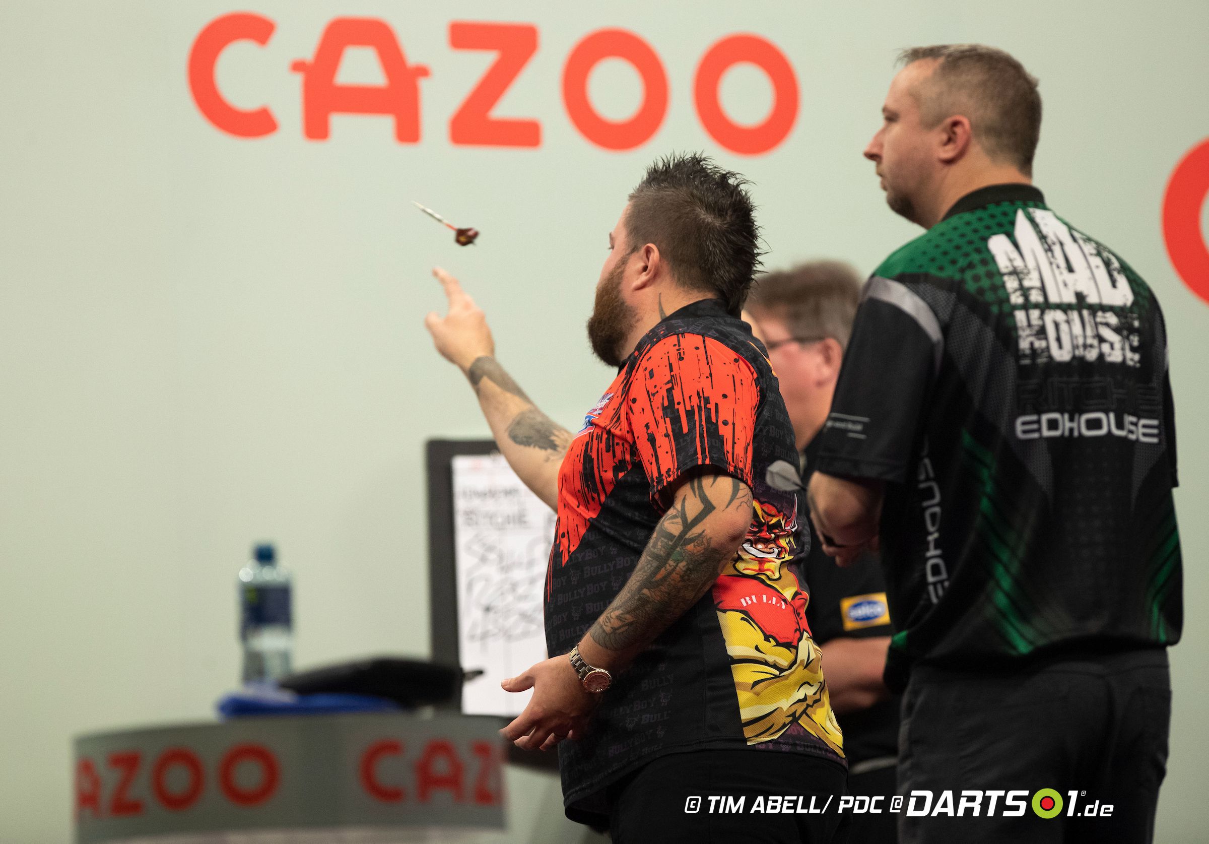 In den ersten beiden Partien der neuen Woche wurde nur um die goldene Ananas gespielt. Nach zwei Siegen stand Dirk van Duijvenbode sicher in der nächsten Runde, für seinen Gegner Adam Gawlas hatte sich dieses Thema bereits erledigt. Nachdem die ersten beiden Legs des Abends bereits als Break gewonnen worden waren, patzte Gawlas dreimal auf Doppel und ermöglichte dem Niederländer ein weiteres Break. Umgekehrt lief es wenig später, van Duijvenbode warf zweimal am äußeren Ring vorbei und kassierte das 2:2. Der „Titan“ brachte sich anschließend durch ein 86er-Finish erneut in Führung und schaffte es danach erstmals, den eigenen Anwurf nach Hause zu bringen. Mit einem hervorragenden 11-Darter sicherte sich Gawlas noch seinen dritten Leggewinn, danach machte van Duijvenbode mit einem 83er-Finish den Deckel drauf. Er entschied auch das dritte Match in diesem Turnier für sich und beendete die Gruppe D als Tabellenerster.