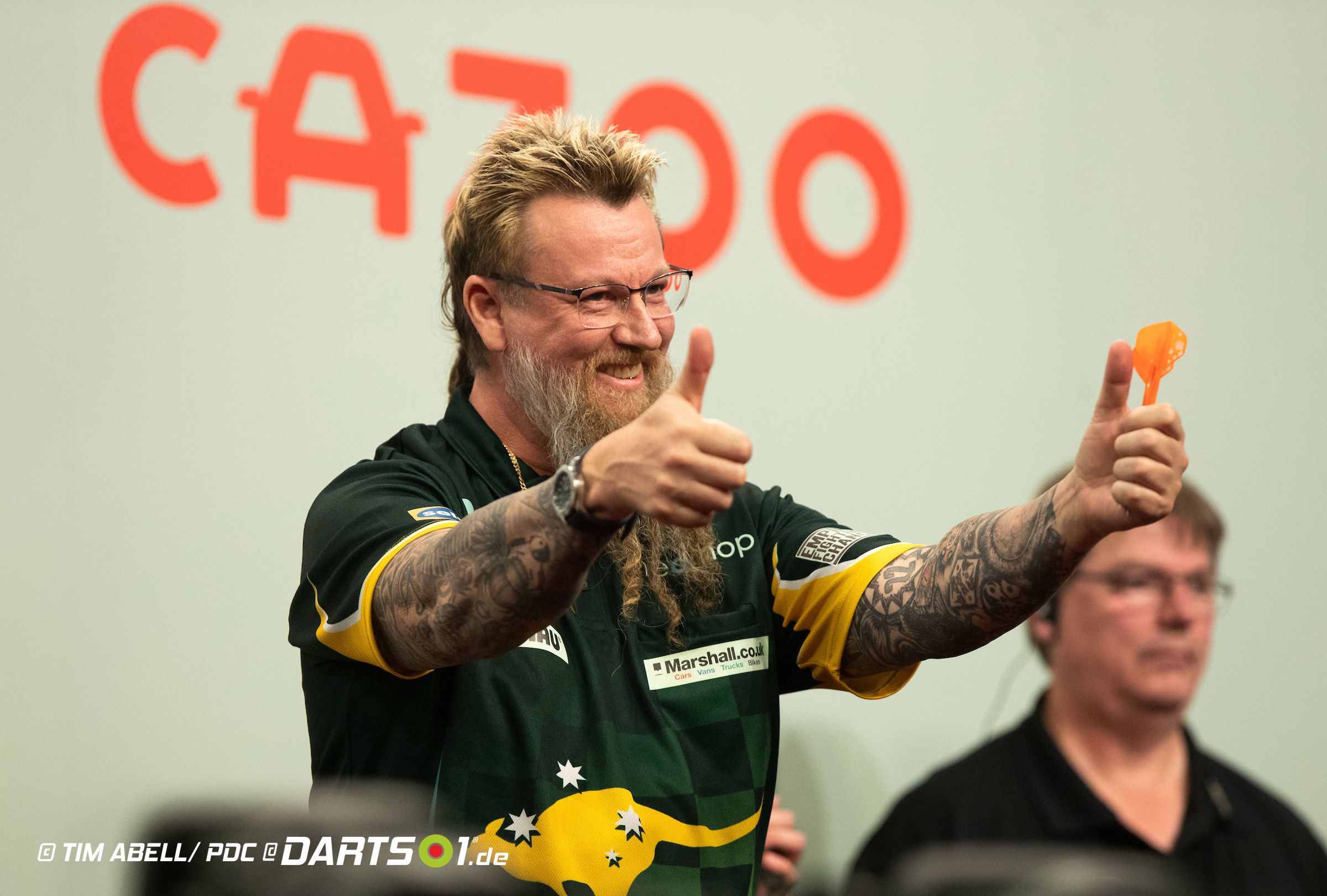 Danach flogen in der Gruppe B die Pfeile. Simon Whitlock hatte die Möglichkeit, mit einem Sieg über Außenseiter Christian Perez einen gewaltigen Schritt in Richtung K.O.-Runde zu gehen. Allerdings gelang Perez im Auftaktleg sofort ein Break, hierfür hatte er 91 Zähler ausgemacht. Whitlock verpasste wenige Aufnahmen danach aufgrund von zwei Fehlwürfen auf Doppel die direkte Antwort und holte seinen ersten Leggewinn erst anschließend per 13-Darter. Der „Wizard“ hatte nun endgültig ins Spiel hineingefunden und drehte die Partie mit einem weiteren 13-Darter sowie einem 14-Darter zu seinen Gunsten. Perez stoppte den Lauf seines Gegners mit einem 15-Darter und kam damit zum 3:3. Schlussendlich hatte aber Whitlock den längeren Atem. Der Australier versenkte seinen zweiten Matchdart einige Minuten später in der Doppel-13 und holte sich zwei wichtige Punkte.