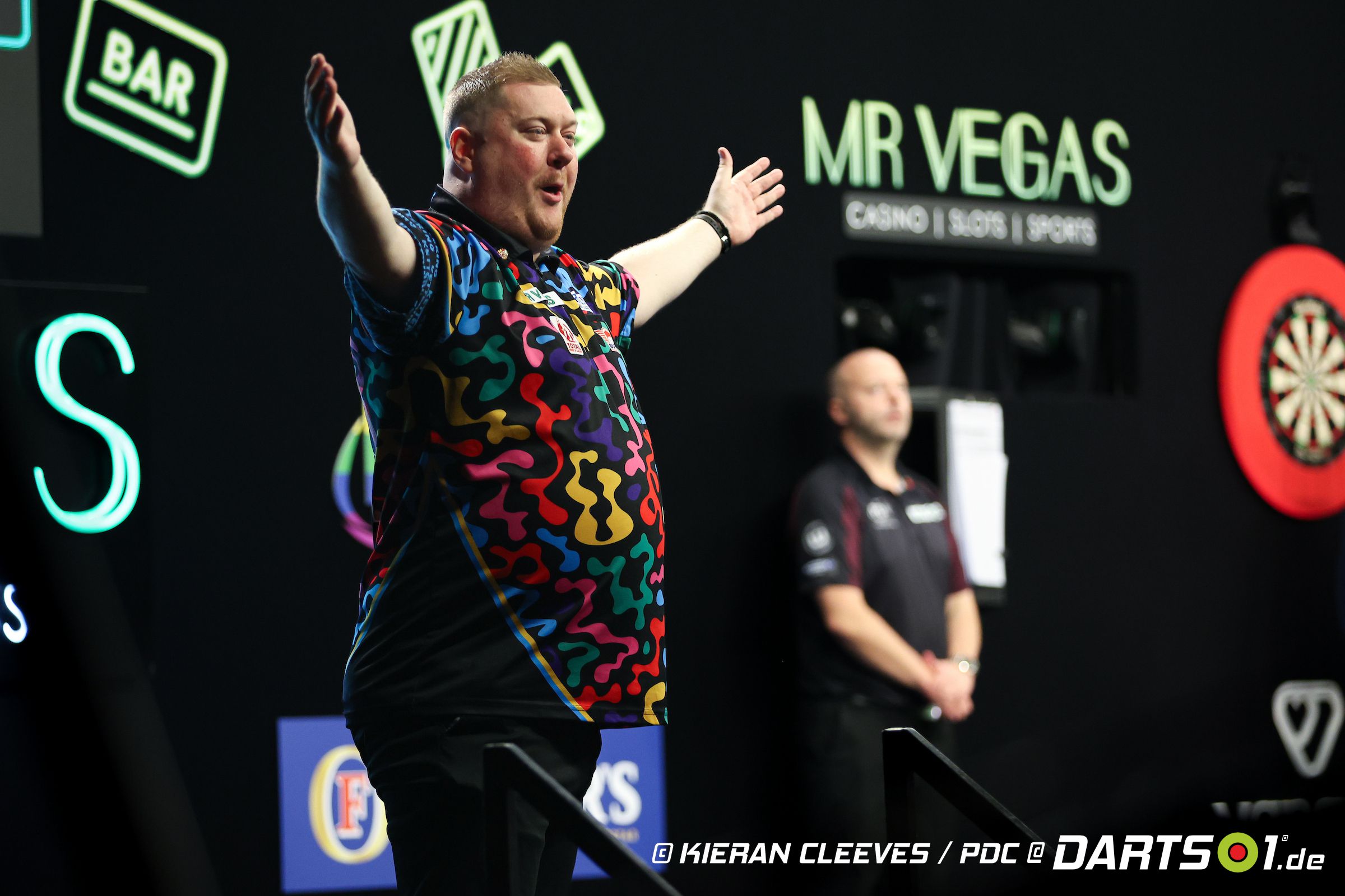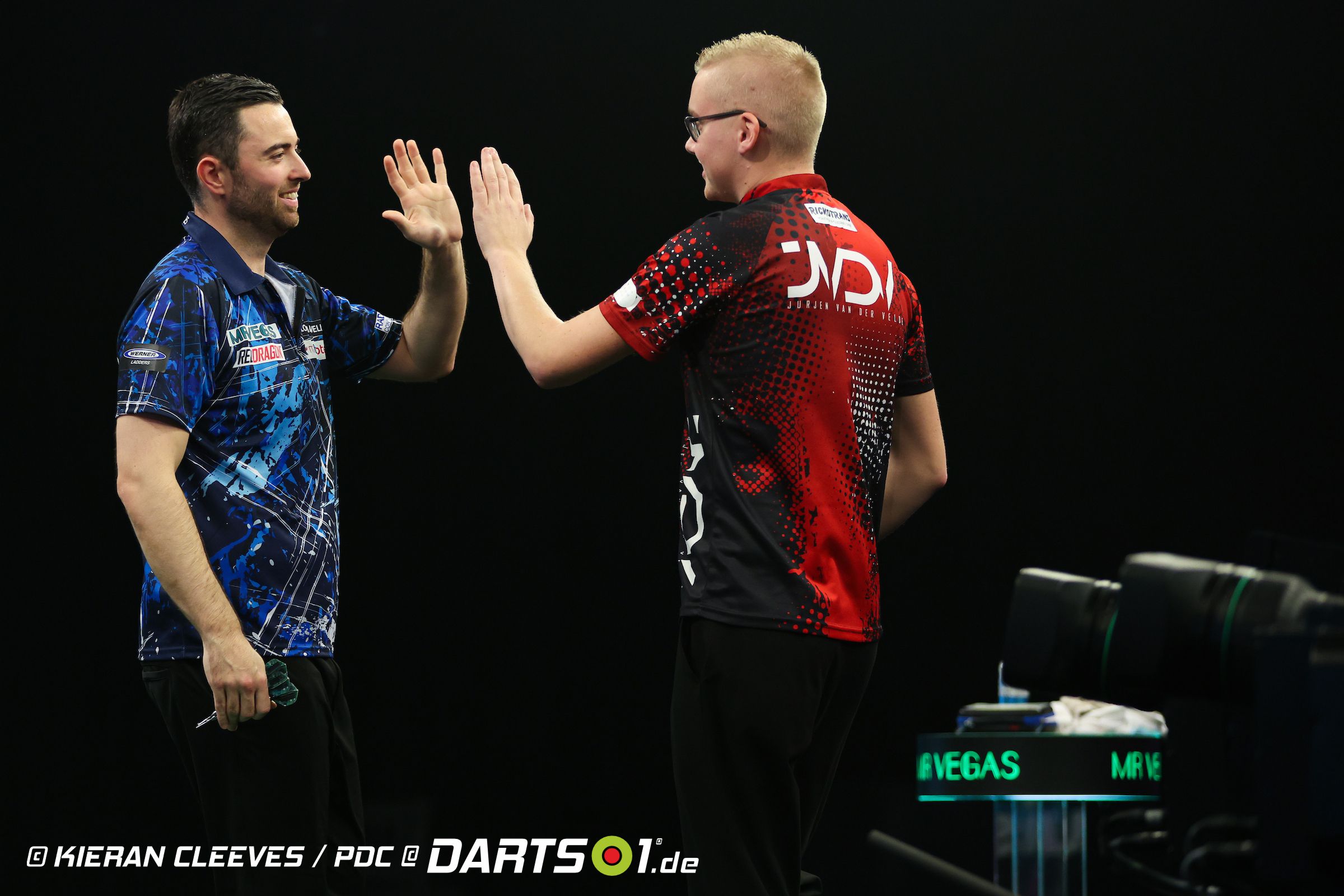 Ein echtes Ausrufezeichen setzte danach Luke Humphries, der Jurjen van der Velde mit 10:3 bezwang. Trotz einer Nackenverletzung lieferte die Nummer eins der Welt eine nahezu makellose Vorstellung ab. Mit einem Average von 108,55 Punkten – dem dritthöchsten je in der zweiten Runde des Grand Slam – und einer Checkout-Quote von 77 Prozent dominierte „Cool Hand Luke“ von Beginn an. Nach fünf Legs führte er bereits 5:0 und stand zu diesem Zeitpunkt bei einem Schnitt jenseits der 119 Punkte. Van der Velde wehrte sich mit einem spektakulären 164er-Highfinish, doch Humphries blieb unantastbar und beendete das Match mit einem 13-Darter auf Tops.