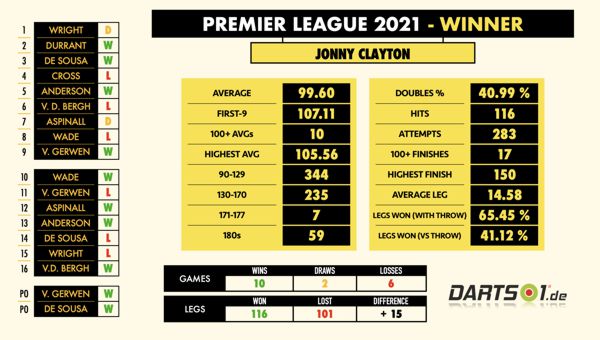 Zum Abschluss der Berichterstattung der Premier League of Darts 2021 muss selbstverständlich die Leistung des Gewinners Jonny "The Ferret" Clayton aus Pontyberem, Wales gewürdigt werden.