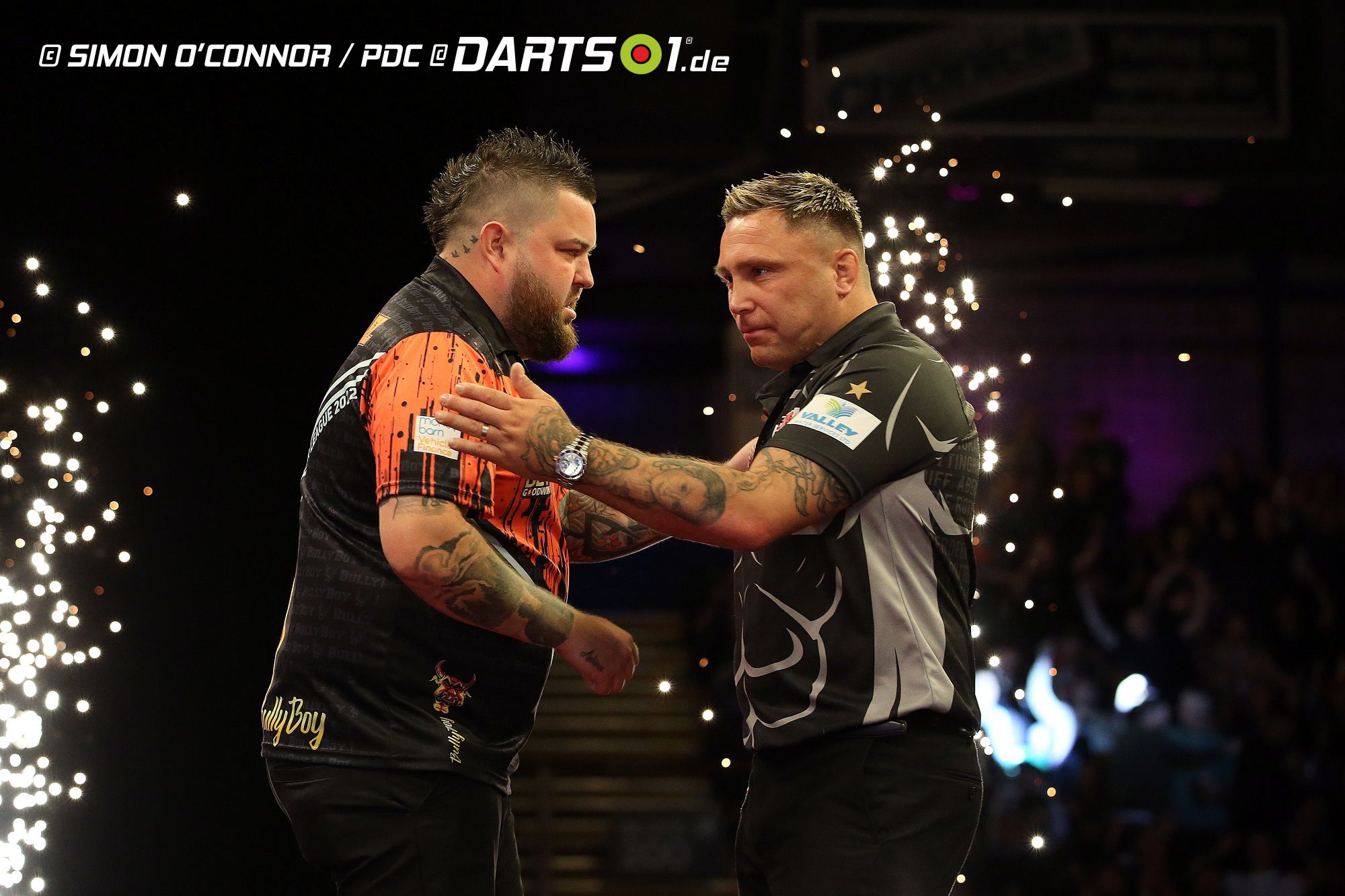 Genau wie an den letzten drei Spieltagen auch, bekamen es heute Michael van Gerwen und Michael Smith einmal mehr miteinander zu tun. Nach einem ausgeglichenen Start sorgte van Gerwen für den ersten Höhepunkt, als er 155 Punkte auf der Doppel-19 checkte. Danach ließ der Niederländer einen Breakdart ungenutzt, sodass Smith zum 2:2-Ausgleich kam. In den nächsten Minuten erhöhte der „Bully Boy“ die Schlagzahl, er sorgte durch ein 114er-Highfinish selbst für das erste Break und bestätigte dieses mit einem 78er-Checkout. Durch ein 86er-Finish verkürzte van Gerwen, doch Smith antwortete mit einem 15-Darter und stand kurz vor dem Sieg. „Mighty Mike“ machte zwar noch 74 Zähler aus, damit zögerte er sein Ausscheiden jedoch nur hinaus. Smith brachte seinen zweiten Matchdart in seiner favorisierten Doppel-20 unter und freute sich über den 6:4-Erfolg.