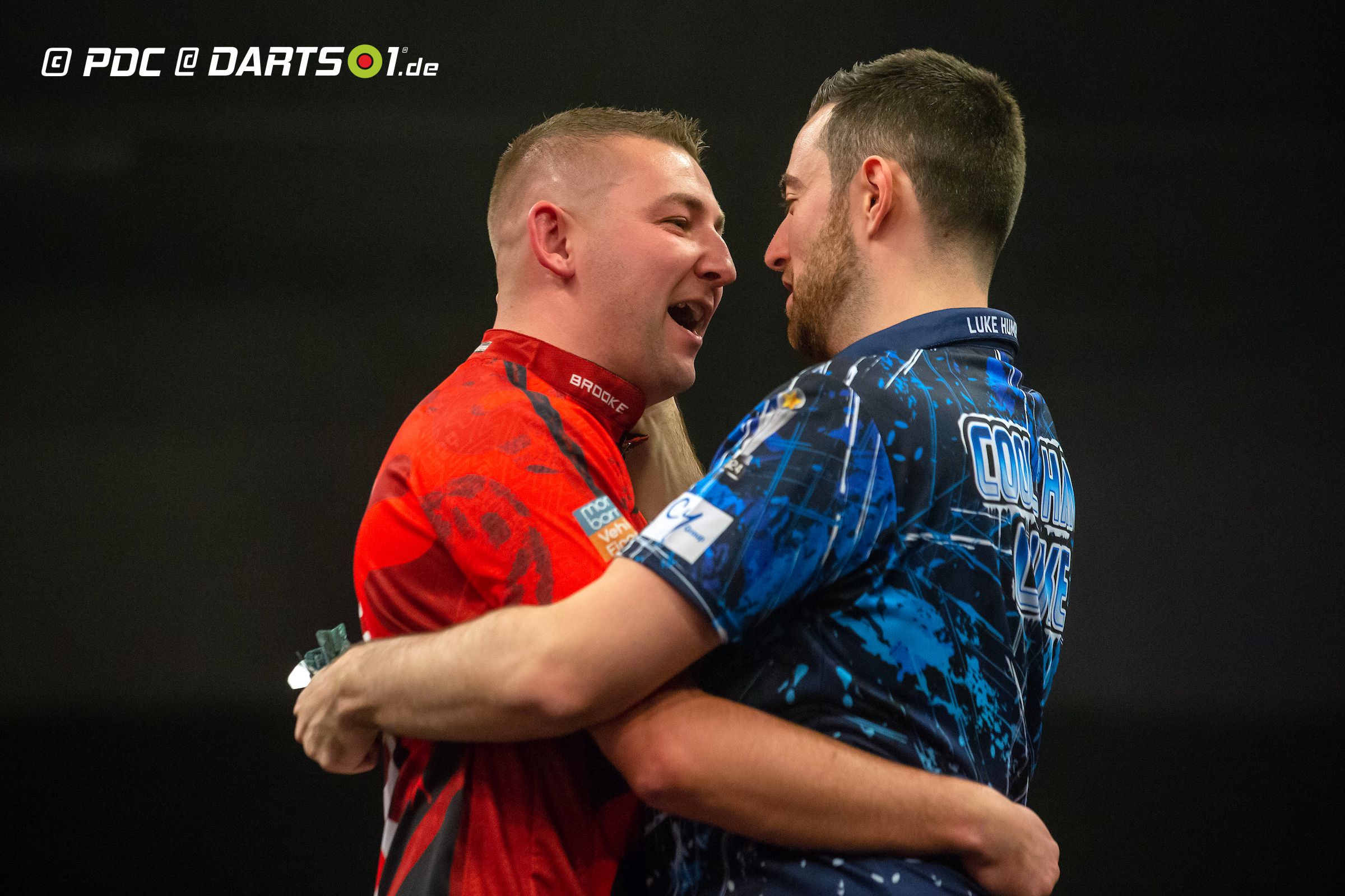 Die erste Runde beschlossen Luke Littler und Michael Smith. Die ersten vier Runden teilten sie gerecht unter sich auf, wobei gerade im dritten und vierten Durchgang jeder seinen Anwurf mit Riesenvorsprung, mehr als ungefährdet einsackte, 2:2. Ab Leg Fünf übernahm Luke Littler das Zepter, das er auch nicht mehr aus der Hand gab, 3:2. Den 12-Darter im sechsten Durchgang beendete „The Nuke“ mit High-Finish, 140 (T18, T18, D16), 4:2. Der Double-Trouble im siebten Leg ereilte Michael Smith zum denkbar ungünstigsten Zeitpunkt, was zur Folge hatte, dass der Weltmeister von 2023 nunmehr 2:5 in Rückstand geriet. Im achten Durchgang bereitete sich Luke Littler mit dem Maximum als Set-up-Shot die Double-8 vor, auch die war mit der nächsten Aufnahme Geschichte. Dass Michael Smith mit fast 102 Punkten im Average gerade mal zwei Leggewinne einkassieren würde, hätte er sich vorher vermutlich auch nicht vorstellen können. Auf jeden Fall hieß der 6:2-Sieger in diesem Match: Luke Littler.