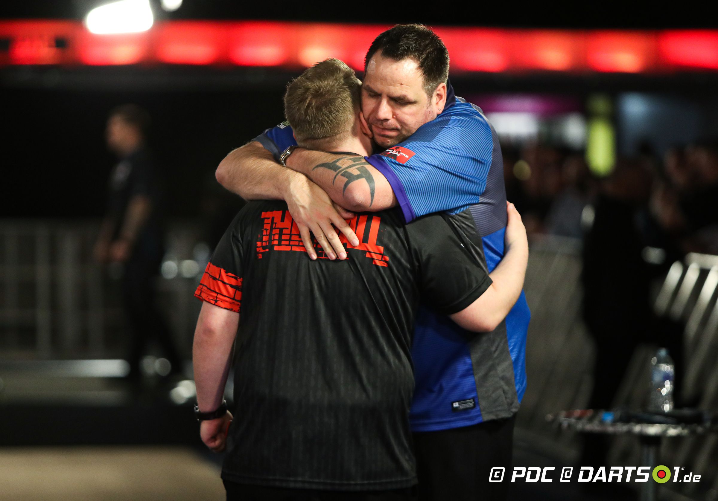 Währenddessen kam es auf der zweiten Bühne zum Aus des Titelverteidigers. In einer hochklassigen Neuauflage des Halbfinals aus dem vergangenen Jahr unterlag Danny Noppert William O’Connor knapp mit 9:10. Noppert erwischte den etwas besseren Start in das Match und lag unter anderem dank eines 124er-Checkouts auf dem Bullseye mit 4:2 vorne, ehe O’Connor dank vier Leggewinnen nacheinander die Führung an sich riss. Der Weltranglistenachte steckte den Rückstand schnell weg, beim Stand von 8:8 war die Partie weiter vollkommen offen. Im 17. Leg der Partie erzielte Noppert mit einem 134er-Finish über Triple-18 und zweimal Tops das vermeintlich vorentscheidende Break, er brachte die Führung bei eigenem Anwurf aber nicht ins Ziel. O’Connor breakte mit einem 15-Darter, durfte das Entscheidungsleg beginnen und machte dort mit einem weiteren 15-Darter sein Weiterkommen perfekt.