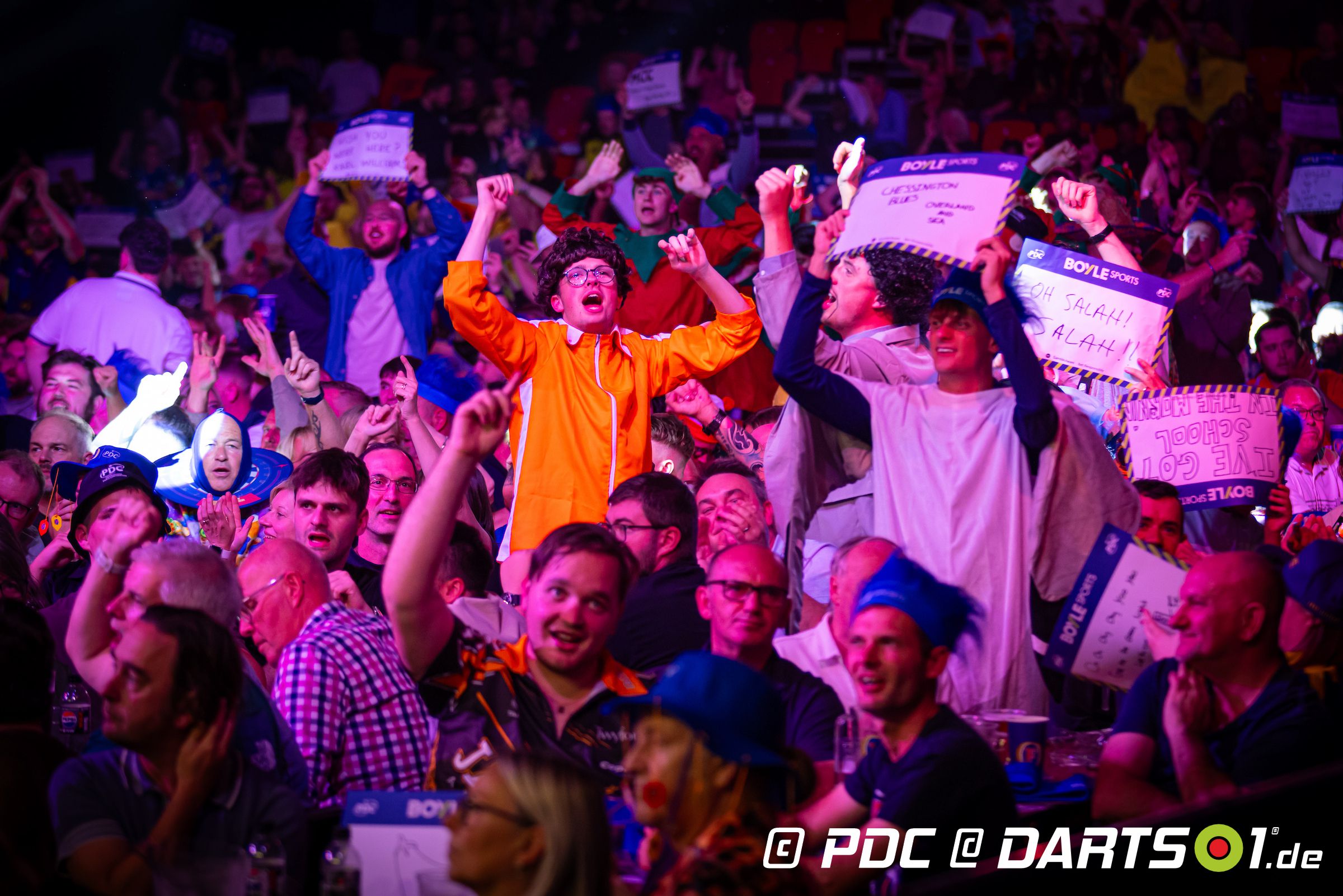 Zum Abschluss des Abends durfte auch Josh Rock jubeln. Der Nordire setzte sich in einer wechselhaften Partie gegen Ryan Joyce mit 2:1 durch. Nach einem Fehlstart drehte Rock im zweiten Satz auf, ehe er im entscheidenden Durchgang mit einem 108er-Finish den Sack zumachte. Für den jungen Nordiren war es der erste Sieg überhaupt beim World Grand Prix.