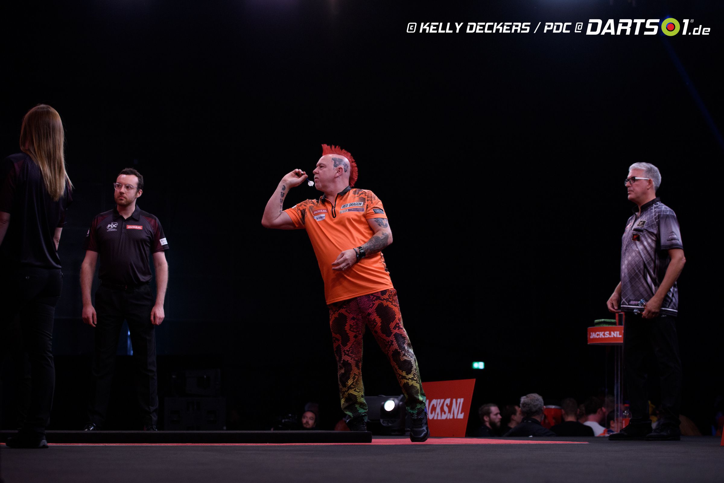 Als Nächstes folgte die Begegnung zwischen Gerwyn Price und Daryl Gurney, gleichzeitig war dies das erste Spiel zweier Protagonisten, die erst am heutigen Nachmittag ihre Erstrundenpartie absolviert hatten. Gerwyn Price hatte hierbei Cameron Menzies eine herbe 6:2 Klatsche erteilt, während Daryl Gurney einen teilweise äußerst missgestimmten Dirk van Duijvenbode aus seinem Heimatturnier warf. War Gerwyn Price in der Nachmittagssession noch mit viel Verve und Emotion unterwegs gewesen, so zeigte er sich heute Abend schon wieder bedrohlich bedächtig. Selbst die Unterstützung von Gattin Bethan, die mit nach Amsterdam gereist war, konnte ihn heute Abend nicht ausreichend motivieren, relativ tatenlos musste er zusehen, wie Daryl Gurney in gemäßigtem Tempo die ersten drei Durchgänge einkassierte, 3:0. Im vierten Durchgang war auch Gerwyn Price dank 14 respektablen Würfen, endlich auf der Leg-Anzeigengrafik gelandet, 1:3. Doch im fünften Leg packte der Nordire den 12-Darter aus: 94 – 140 – 180 – 87, damit baute er seine Führung wieder aus, 4:1. Im sechsten Durchgang grätschte der „Iceman“ mit gekonnter Vorbereitung (127) und insgesamt 14 Würfen nochmal dazwischen und verkürzte auf 2:4. Daryl Gurney ließ jedoch im sechsten Leg nichts anbrennen und erhöhte auf 5:2. Ein letztes Aufbäumen vom Waliser in Durchgang Acht, damit schaffte er das 3:5. Daryl Gurney wird sich die vorausgegangenen Partien nicht zum Beispiel genommen haben, trotzdem hatte auch er sein bestes Leg für den Schluss aufgehoben: 140 – 180 – 130 – 51, der 11-Darter gereichte Daryl Gurney zum 6:3-Erfolg über Gerwyn Price.